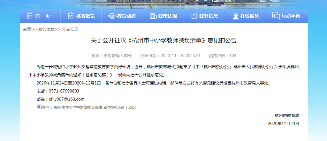 2020年11月24日至2020年12月1日,各单位和社会各界人士可通过电话、邮件等方式将有关意见建议反馈至杭州市教育局人事处。